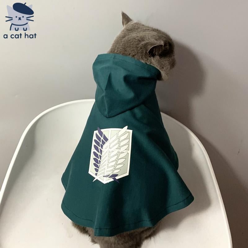 Calling all Attack on Titan enthusiasts with a soft spot for their cats! This charming cat cape is crafted from durable yet comfortable fabric. It sports the signature green color reminiscent of the Survey Corps' uniforms, and prominently features the Wings of Freedom emblem on the back. Whether it's for a pet - themed cosplay event, a photoshoot, or simply to indulge your love for the anime while making your cat look super cool, this cape is a fantastic addition to your cat's wardrobe. It's designed for easy wear and removal, ensuring that dressing up your feline friend is a breeze.