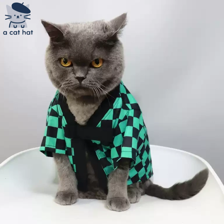 xThis cat kimono draws inspiration from Nezuko's outfit in the popular anime Demon Slayer. Featuring the iconic black - and - green checkered pattern, it perfectly replicates the classic design from the series. Made of soft and skin - friendly fabric, it ensures your cat feels comfortable and unrestricted in movement. Whether for an anime - themed party or daily photo - taking, dressing your cat in this kimono will make them the center of attention instantly, transforming your beloved cat into a cute "Demon Slayer warrior" and bringing lots of fun.