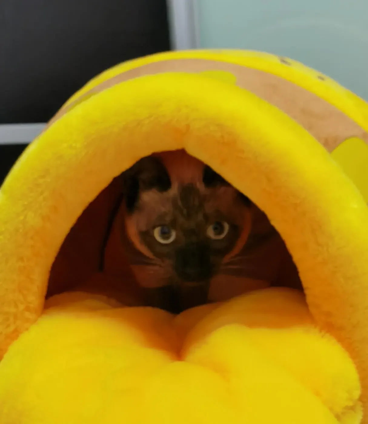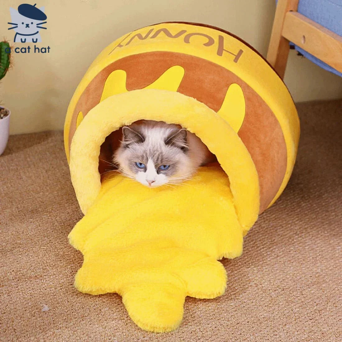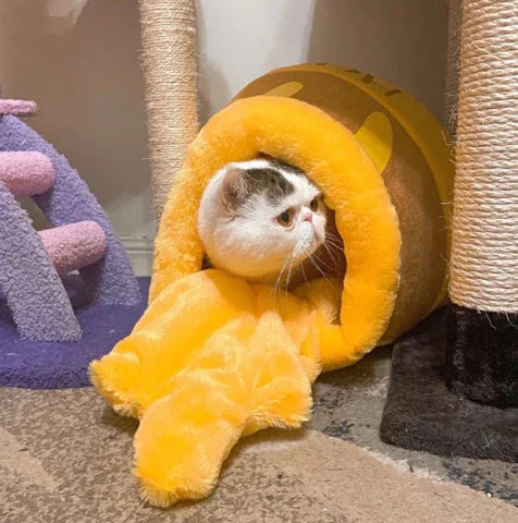 Inspired by the heartwarming honey pot, this cat bed features a brown-yellow color scheme and a "spilled honey" design—your cat peeking out with just its little head will melt your heart instantly!