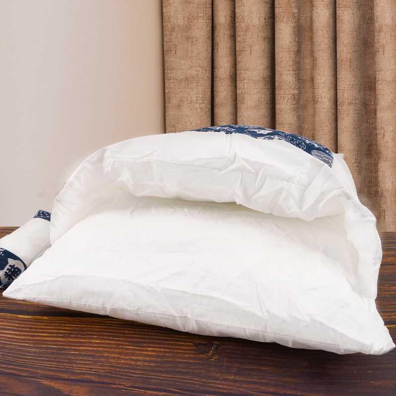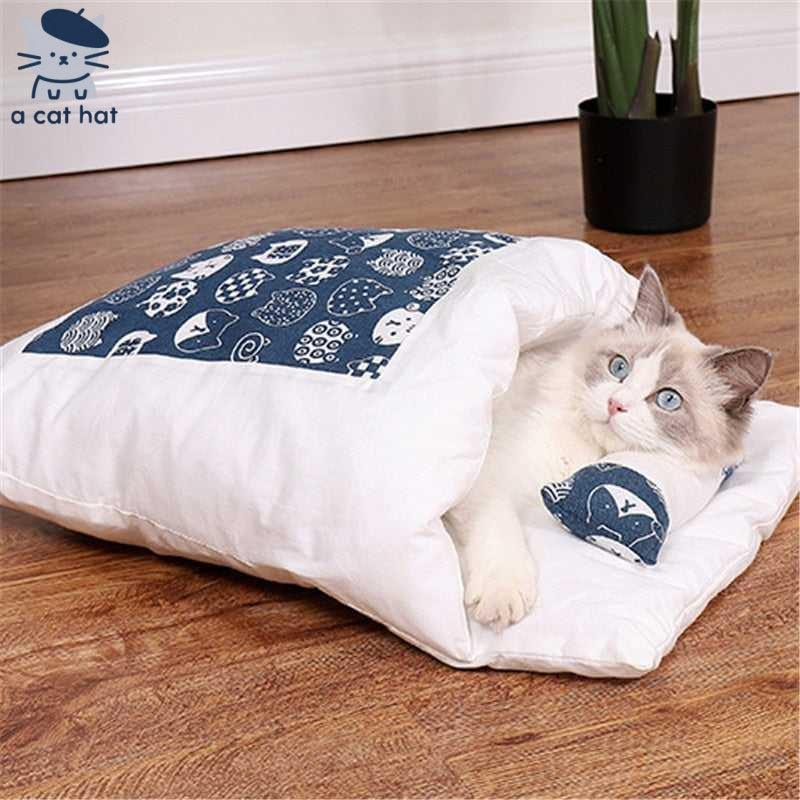 Made of skin-friendly fabric, it features blue-and-white Japanese-style cat patterns—fresh and elegant, perfect for matching Japanese minimalist or wood-style home decor. The combination of the wrap-around bed body and the matching patterned small pillow not only provides a secure, comfortable resting space for cats but also allows your feline friend to curl up or stretch comfortably.