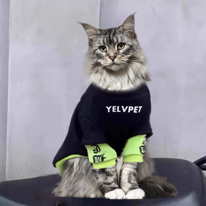 This stylish cat sweatshirt is designed to make your feline friend stand out. Featuring a sleek black main body, it's paired with vibrant neon green sleeves adorned with unique patterns. Made from soft and comfortable fabric, it ensures your cat stays cozy while looking absolutely fashionable. Whether for a casual day at home or a special occasion, this sweatshirt is the perfect way to add a touch of style to your cat's wardrobe.